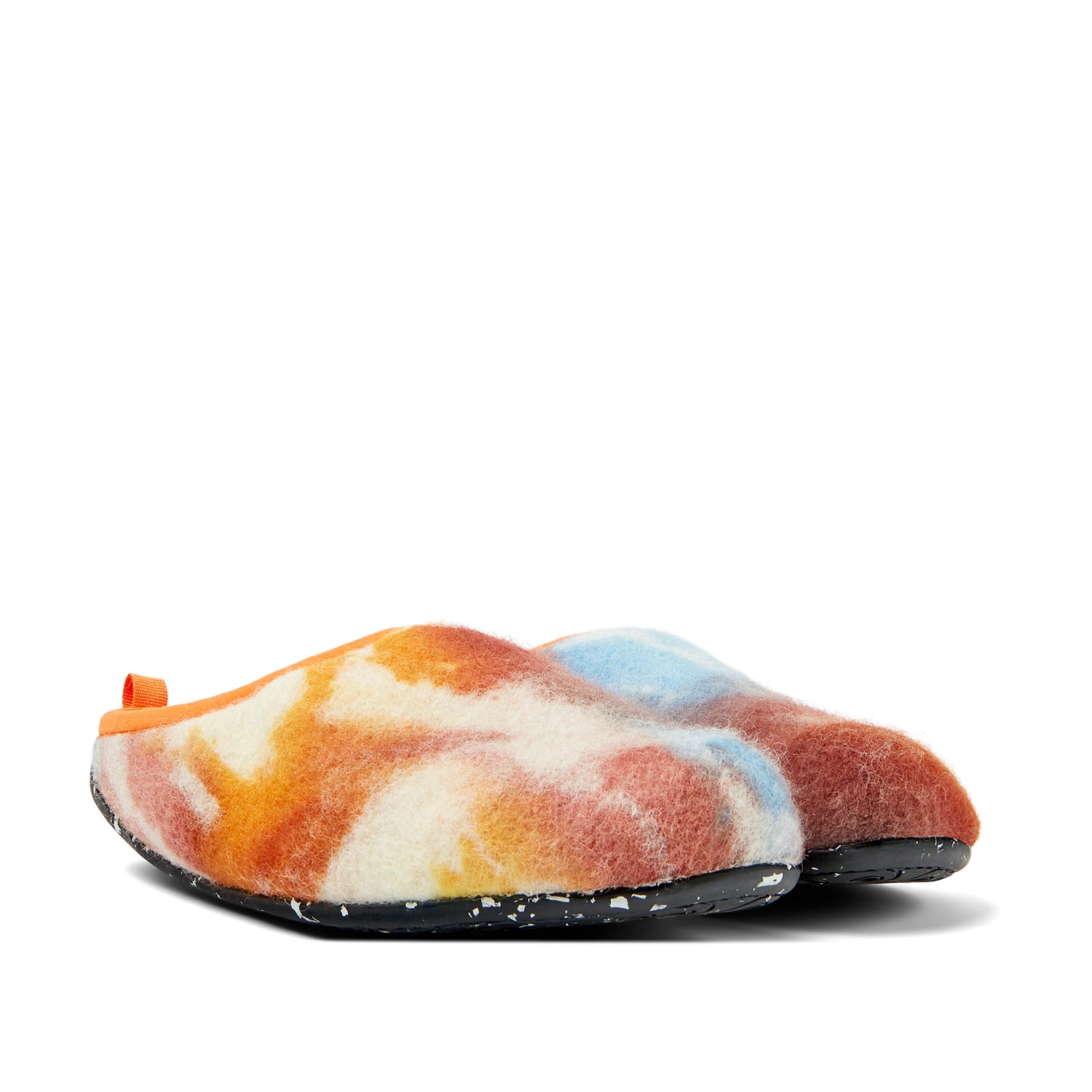 Orange, blue, and white recycled wool men's slippers with EVA footbeds and rubber outsoles. Our iconic Wabi slippers are inspired by Japanese minimalism. Made with the idea of keeping components and production processes to a minimum, these slippers continue to redefine indoor comfort more than twenty years after their debut with soft cushioning and a cozy feel.