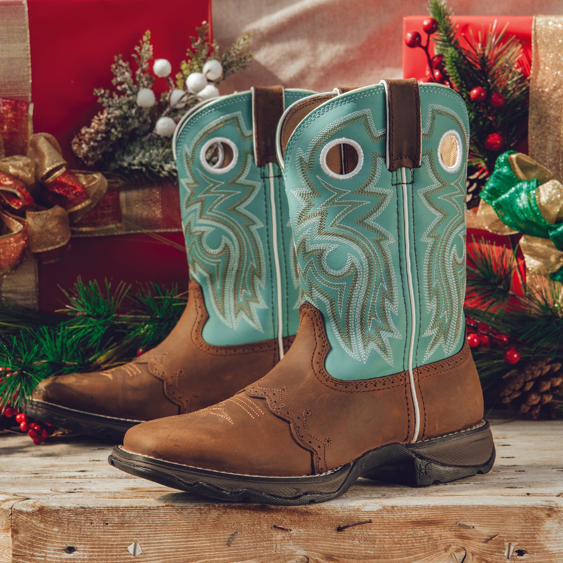 If you're looking for a comfortable yet playful pair of western boots to strut around town then these Durango Brown Powder 'n' Lace Lady Rebel boots are perfect for you!While the cowgirl boots have all of the classic western features a dipped top with white piping pull straps a fancy stitched shaft and a square toe the powder 'n' lace colored upper is a fun way to show off your style. The foot is made from brown full-grain leather to create a nice contrast. You can wear the women's western boots with a great pair of jeans or with a flowing skirt and will look amazing!There are pull loops to make getting the boots on an easier process. You also can walk around in these boots for hours because the lining is equally soft and comfortable.Most women buy footwear that's pretty but would never describe them as being comfortable. You get the best of both worlds with these cowboy boots for women.