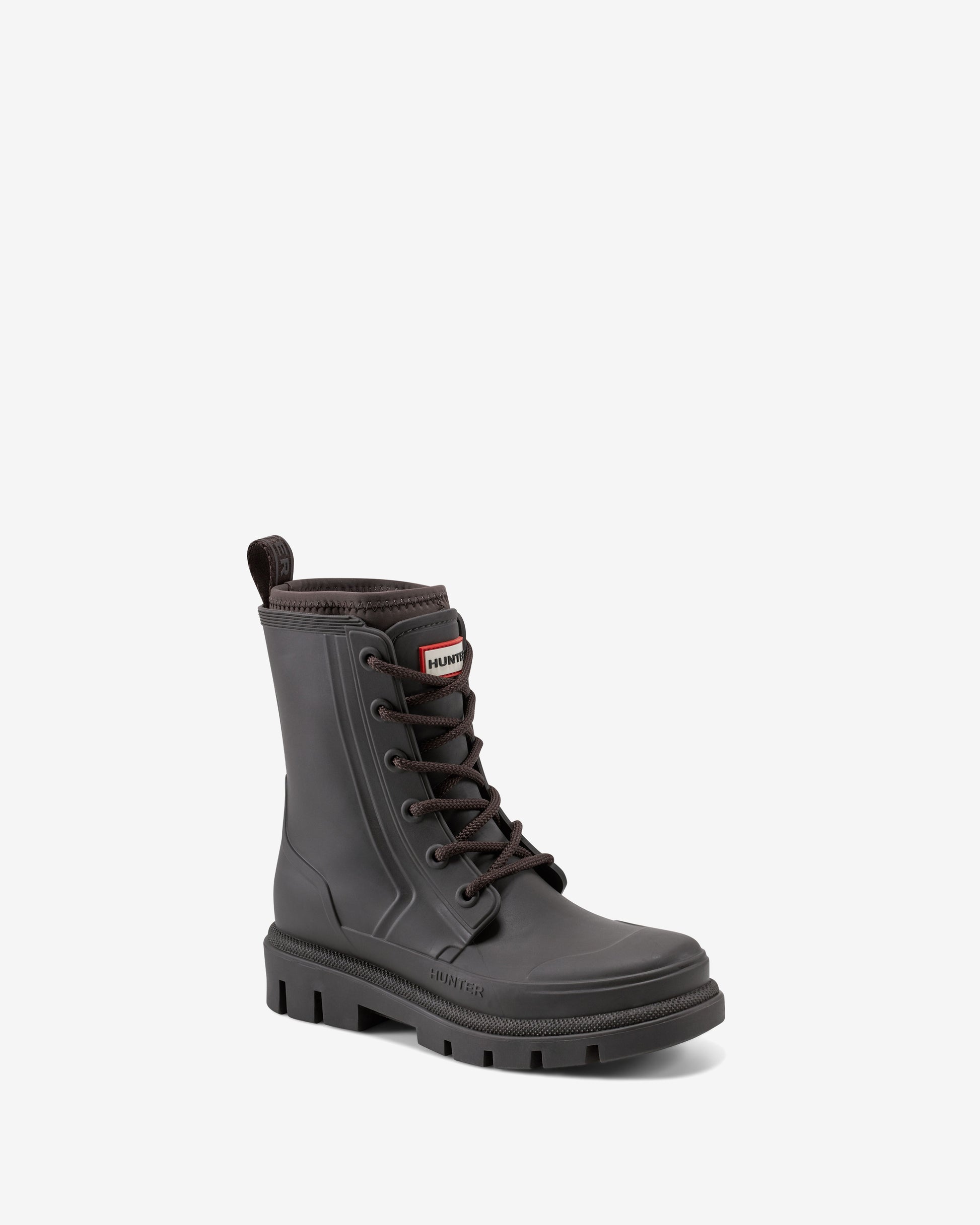 Ready for rain, the Hunter Diana boot is a sleek and stylish waterproof lace-up rain boot with a neoprene upper for style and functionality, complete with fully adjustable laces and a sturdy lug sole.