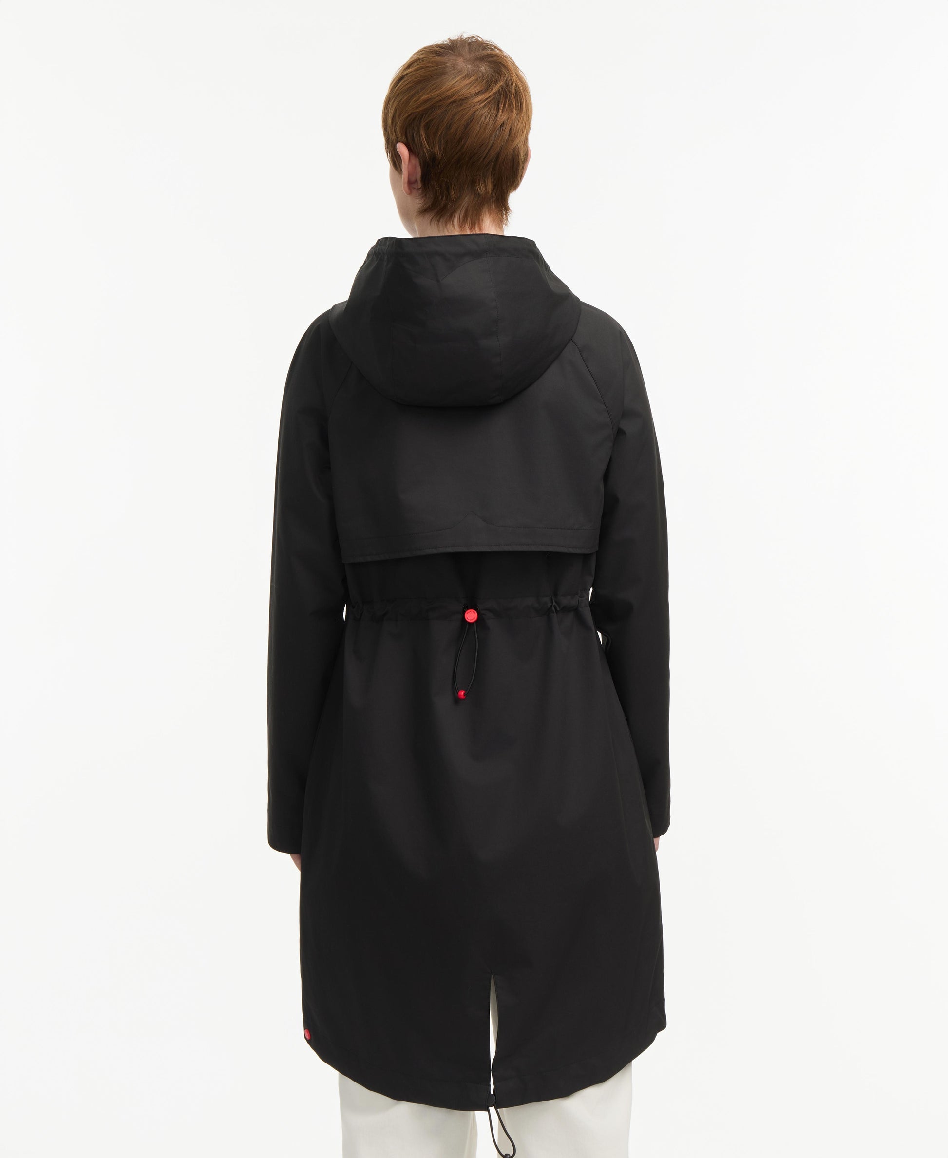 Take on rainy days in the Jency high low hemline rain jacket. Featuring a two-way plastic zipper opening a permanent hood a back loose gunflap and an adjustable waistline at the back for ultimate comfort and weather-ready style.