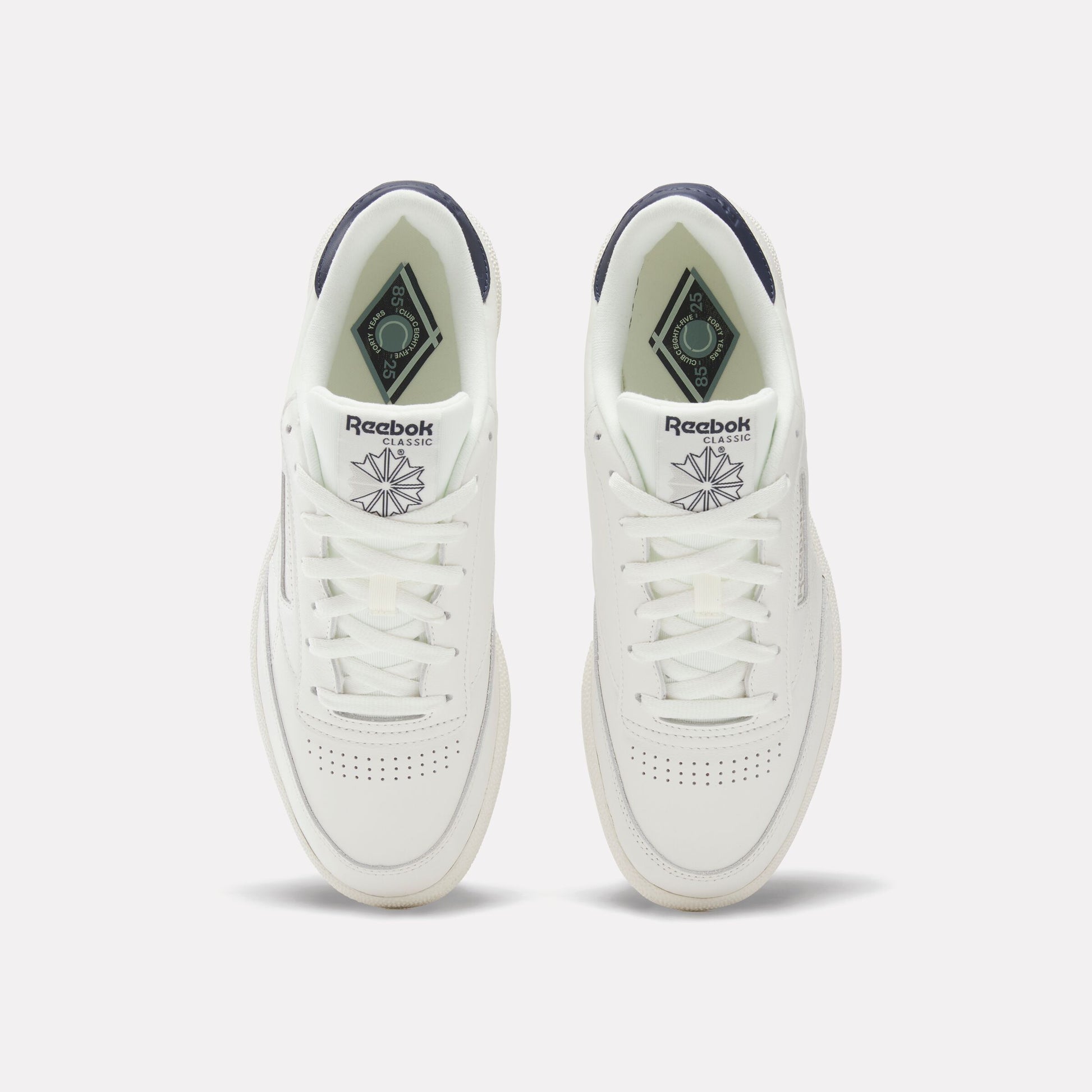 Reebok Club C 85 shoes hit the scene in, you guessed it, 1985. They're still going strong four decades later. This pair goes all out and pops the virtual champagne. The upper is made of luxe, full grain leather. Subtle details cheer for 40 years. Soft metallic accents add the finishing touches.