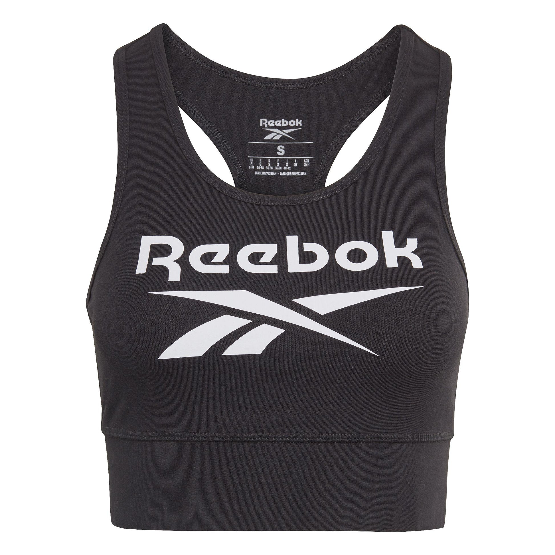 Represent Reebok every day of the week. You don't need to be headed to the gym to appreciate this sports bra. Stretchy cotton is soft, comfortable and provides light support for all the things you do. The racerback gives you plenty of room to move. A bold Vector logo keeps it sporty and rooted in heritage.
